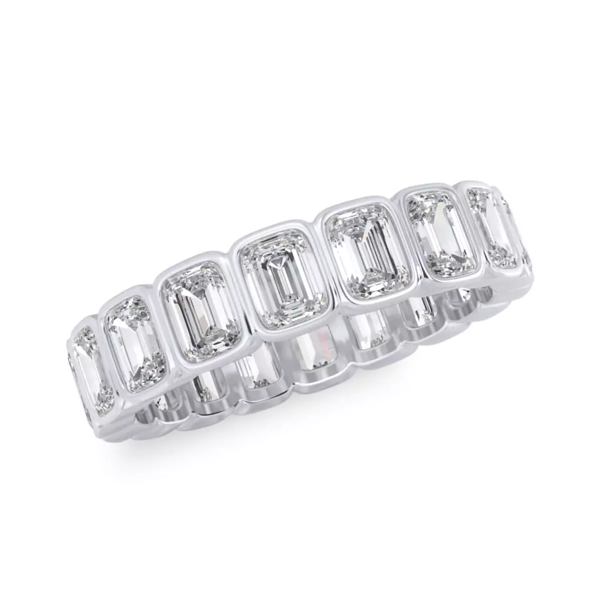 The Bezel Emerald Eternity Band features a sequence of emerald-cut gemstones, each secured in individual bezel settings. The geometry of the stones creates a linear rhythm, while the bezel frames enhance clarity and protect each element. The result is a structured, refined band with a clean architectural presence.